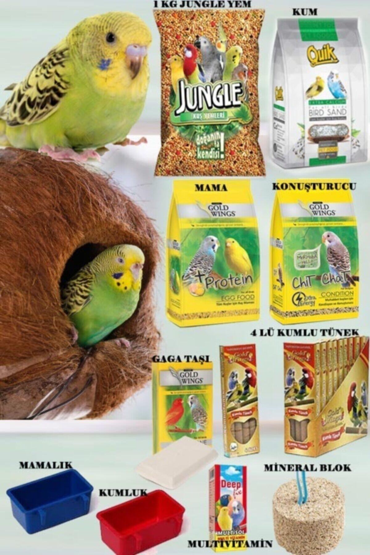 Jungle Muhabbet Kuşu Yem Vitamin Seti ; 1 kg Jungle yem; 8 li Darı; 2 adet mamalık ve kumluk; multivitamin; G.W Mama; 4’lü Kumlu Tünek; Gaga Taşı; Mineral Blok;